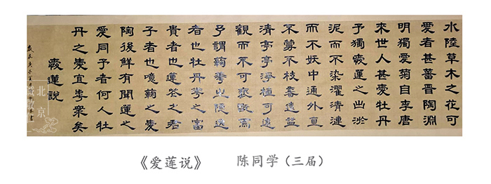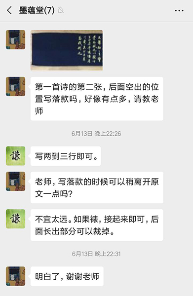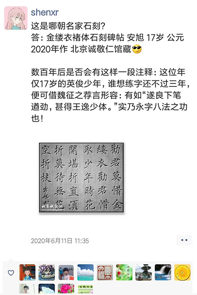 ![]() ![]() 陳同學在江蘇恭書《心經》 習書一年 基礎訓練的牢固,使她在臨習其他書體時進度快了很多,當然也離不開每日的練習。右邊是她寫的《愛蓮說》局部圖。 ![]() ![]() 張同學的書房(江西)也掛著楊老師的吉祥語 她在6月6號的日記上寫到:努力些,總是可以達到的,早晚的事。就如近日習練書法,先有大致的作品安排,寫時就安住手頭的那個字,才容易產生些許的進步。真的欠缺遇事時的鎮靜工夫。 5.一些好玩的 新六藝班的線上書法指導,會在微信群里進行,且每天到知識圈打卡學習心得。 文翰堂是二屆男生的小天地。