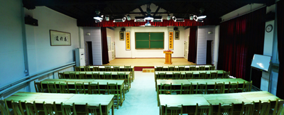 位于公司菜圃旁的多媒體教室,寬敞整潔,布局合理。三扇玻璃門,提供了足夠的通風效果和良好的采光。教室前方正中央安置著寬大平整的講臺,并配以升降式黑板、教學投影儀設備以及舒適的照明,講臺一側還設立了調音室。