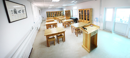 清靜而整潔的兒童書法學習區,位于高大的白樺樹旁。明亮的教室里,井井有條地擺放著可以調節高度的桌椅;